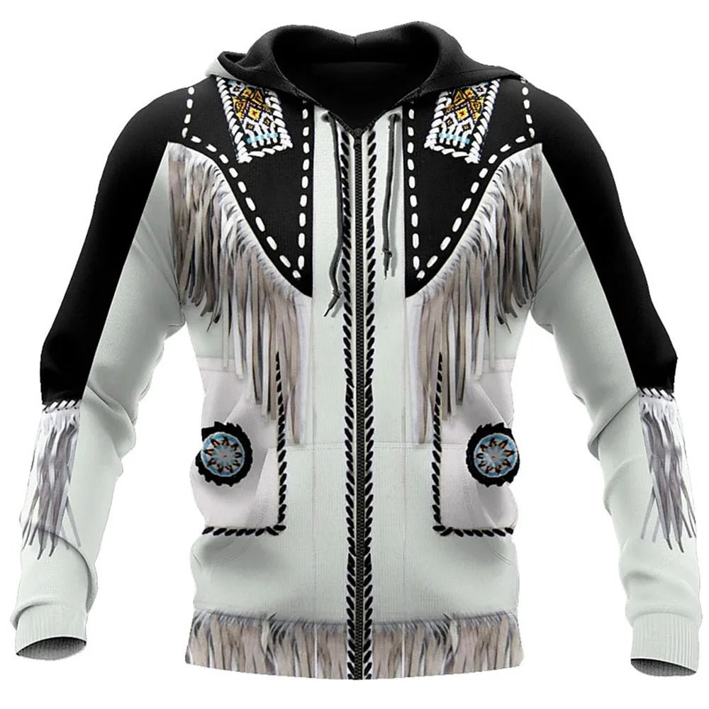 This striking hoodie blends cultural artistry with modern comfort and warmth, making it a standout piece in any wardrobe. With its bold tribal patterns and fringe detailing, it's not just a hoodie, it's a statement.