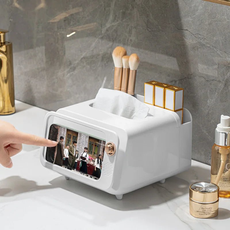 Form and function come together in our combination phone stand, tissue dispenser, and organizer, all wrapped in a chic retro TV design. View your phone while organizing your space with style and ease.